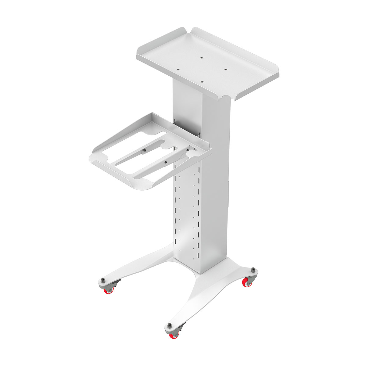 Carrello per miscelatori/bilance per la raccolta del sangue dotato di un ripiano ad altezza variabile e di un ripiano superiore fisso.