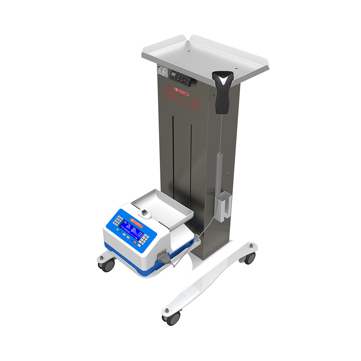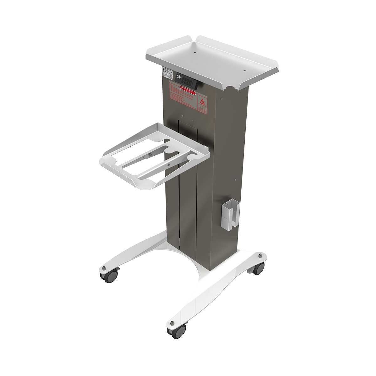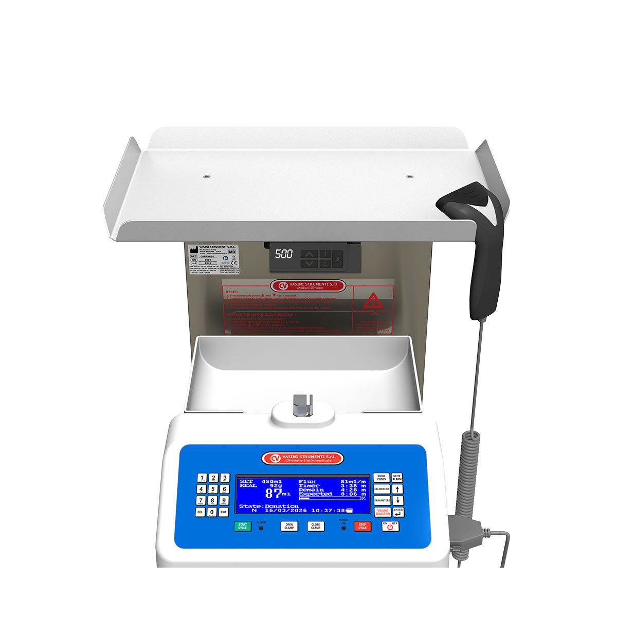 Carrello elettrico regolabile in altezza progettato per portare un miscelatore/bilancia per prelievo di sangue su un ripiano mobile nella posizione di lavoro più comoda per l’operatore, evitando ripetute flessioni, e un ripiano superiore fisso.